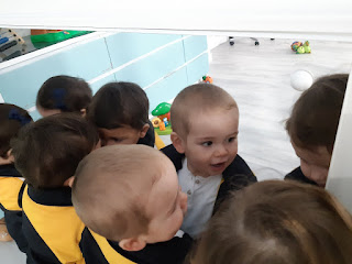 Como podéis comprobar, nos encanta mirarnos y empezar a reconocernos al otro lado del espejo. Para alguno, nuestro reflejo aún es otro amigo distinto a nosotros pero poco a poco nos vamos identificando.